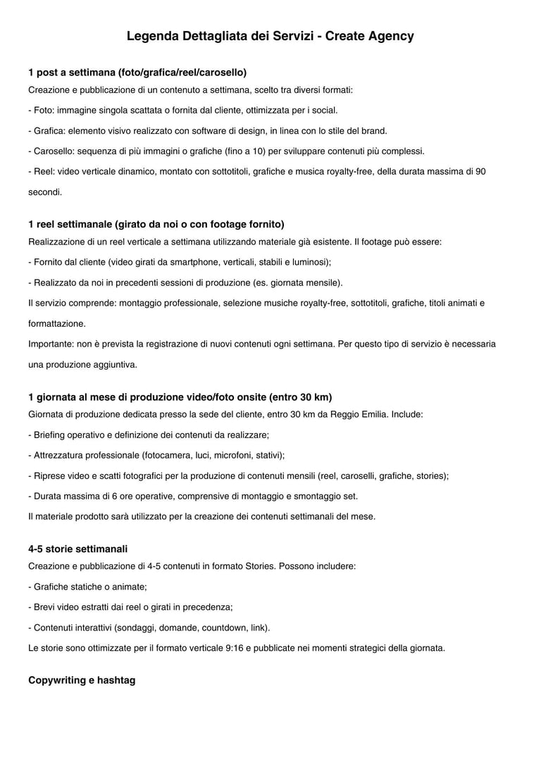 1 reel settimanale (girato da noi o con footage fornito) max.1 shooting al mese di produzione (entro 30km)